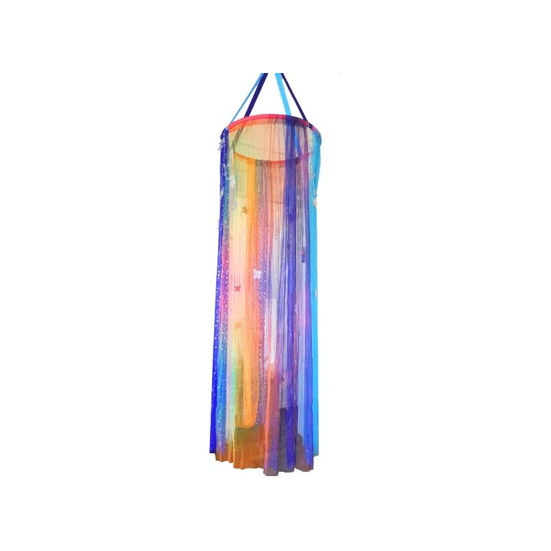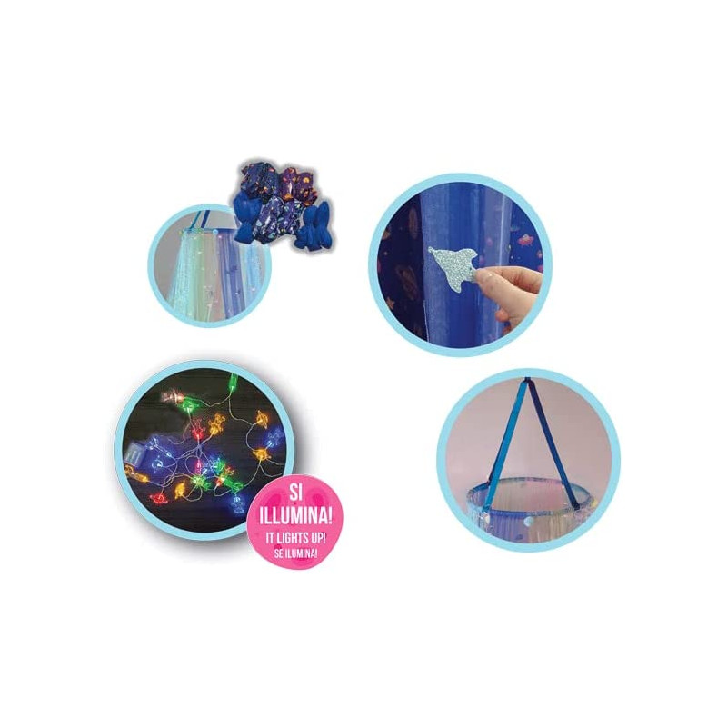 La caja contiene: 1 correa con gancho, 1 estructura circular montable, 9 cortinas de tul de diferentes colores, 8 pompones de colores con cordón, 15 apliques de purpurina de diferentes formas, 1 sistema de luces LED a pilas (3xAAA incluidas)
