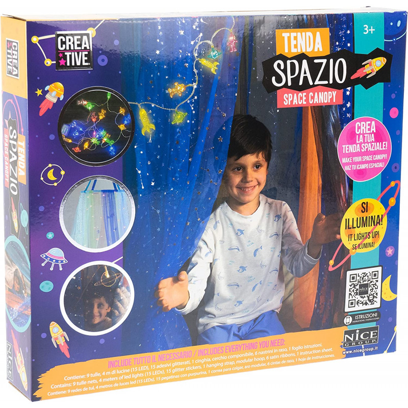 La carpa de juegos Spazio Creative, ligera y colorida, hace del dormitorio un lugar mágico donde los niños pueden entrar a soñar despiertos, si se monta sobre la cama, la transforma en un dosel de ensueño.
