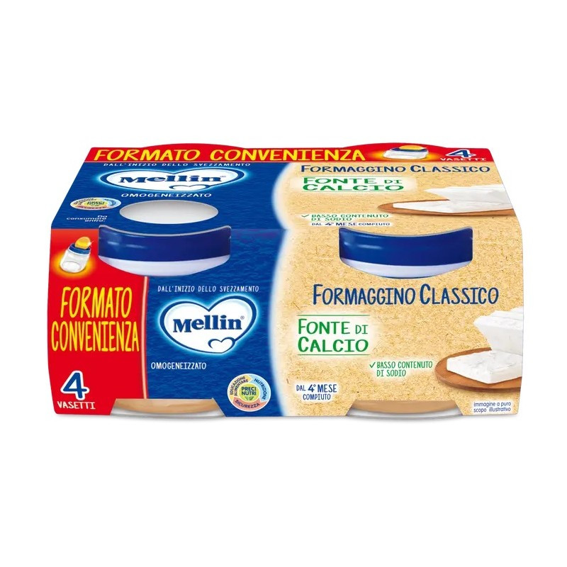 Homogeneizado Formaggino Classico Mellin , indicado a partir del cuarto mes, para introducir el sabor del queso en la primera comida del bebé.